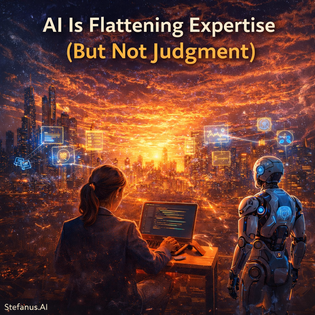 This transformation is not best understood as a direct replacement of human labor by machines, but rather as a structural shift in the value of knowledge itself. Artificial intelligence is flattening expertise by making high-level outputs widely accessible, and in doing so, it is elevating a different and far more scarce capability.