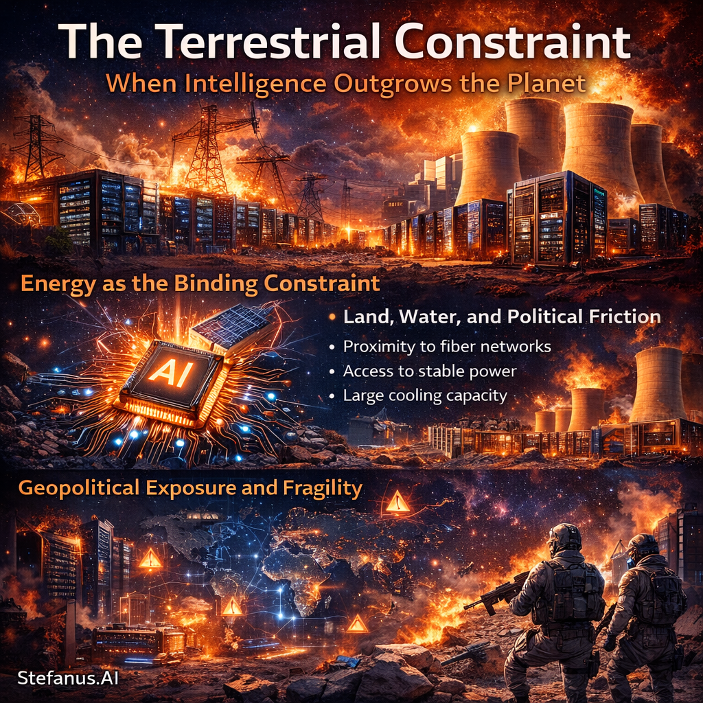 This is why the term “Space-Based Intelligence” is used deliberately. It captures a structural shift now underway: intelligence is no longer confined to code or abstract computation—it is rooted in infrastructure. And that infrastructure, once assumed to be stable and invisible, is becoming both constrained and vulnerable on Earth.